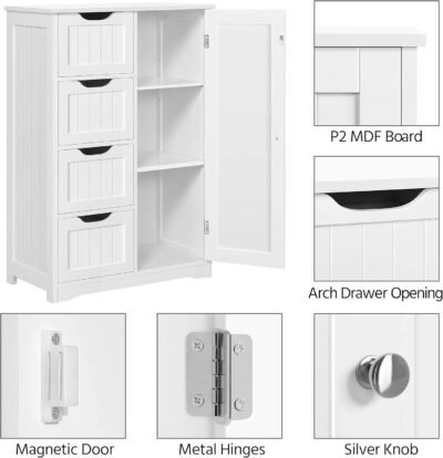 Ideal space saver: Four drawers with cutout handles and one cupboard with a customizable shelf for you to organize different items like cosmetics, toiletries, towels, toilet paper, etc. A great option for tucking away bathroom clutter
