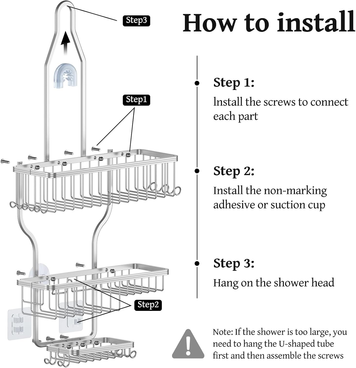 Non-Slip Bathroom Organizer – Thanks to the anti-slip rubber circle on the top of the shower hanger and wall fixing accessories (1 suction cups and 2 adhesive), the shower hanger remains stable even when the shower organizer over shower head is filled with bottles. The two wall fixing methods can apply to a variety of walls, and you can choose one of them according to your needs