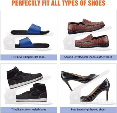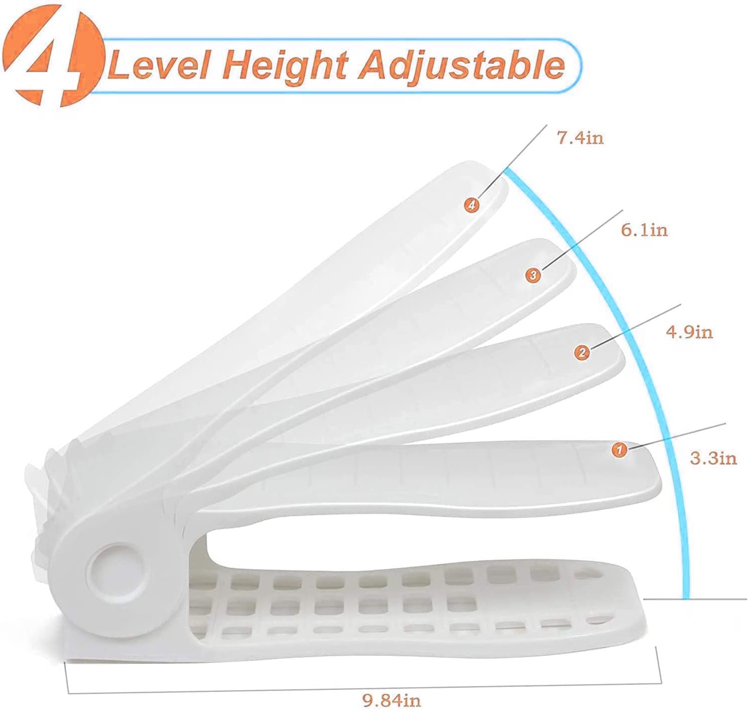 【SUITABLE FOR ALL TYPES SHOES】The shoe slots has 4 adjustable height, You can adjust from 3.3”, 4.9”,6.1” to 7.4” according to the type of shoes, ensure not squeeze, destroy shoes, suitable for most children’s shoes, sports shoes, slippers, flat shoes, sandals, high heels and so on.