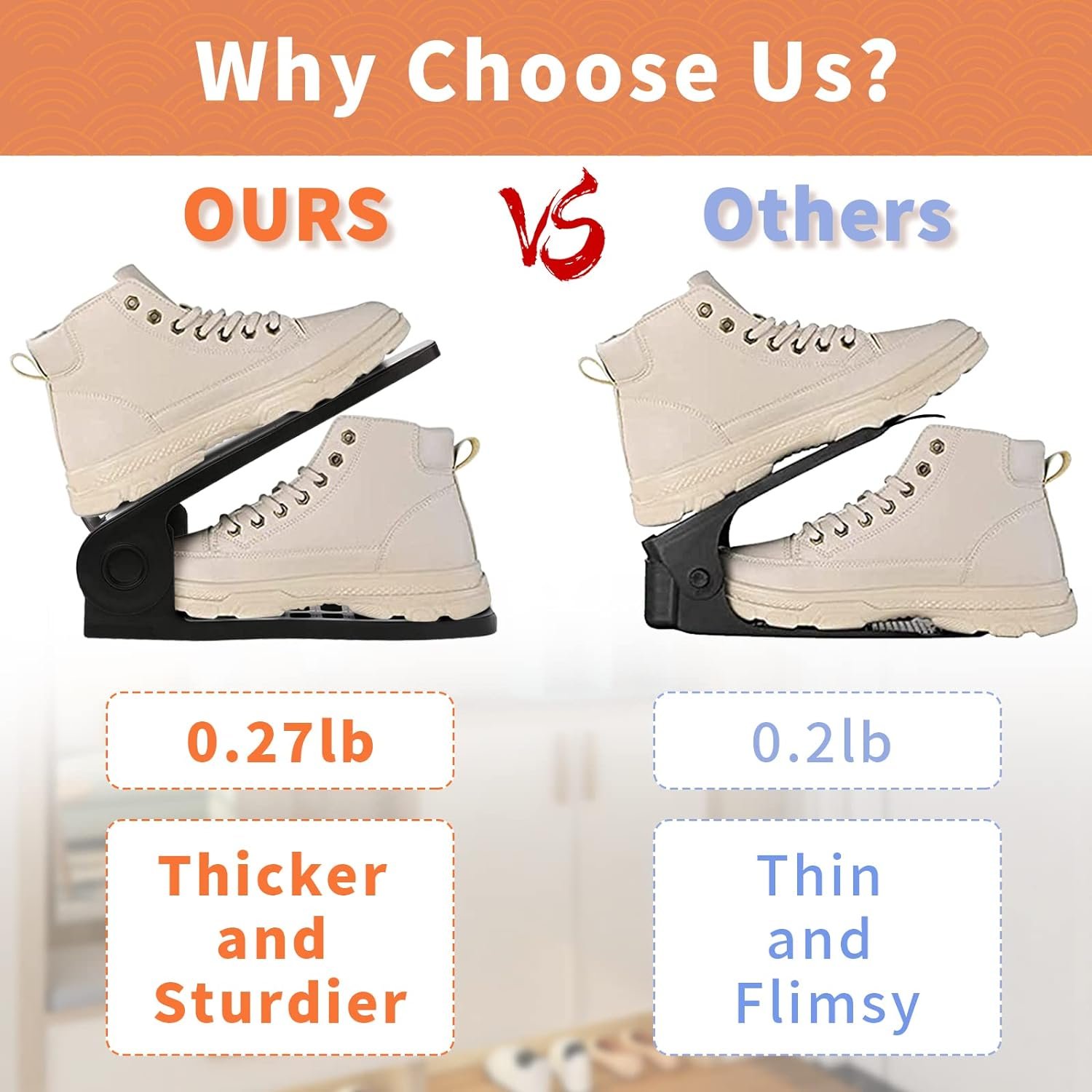 【SUPER ANTI-SLIPPING DESIGN】Our shoe stacker is specifically designed with top flaps at both sides and behind, along with little bumps on the surface to prevent the upper shoe from slipping off, keeping your space tidy and neat. Similar to shoe slotz.