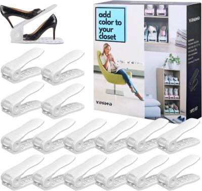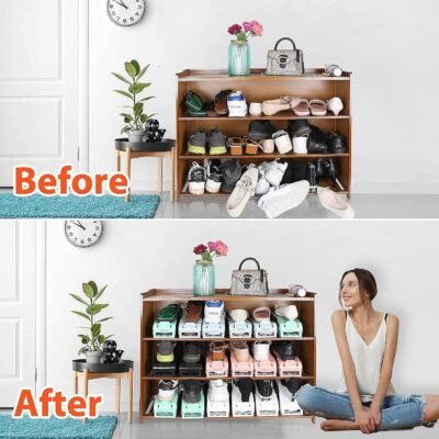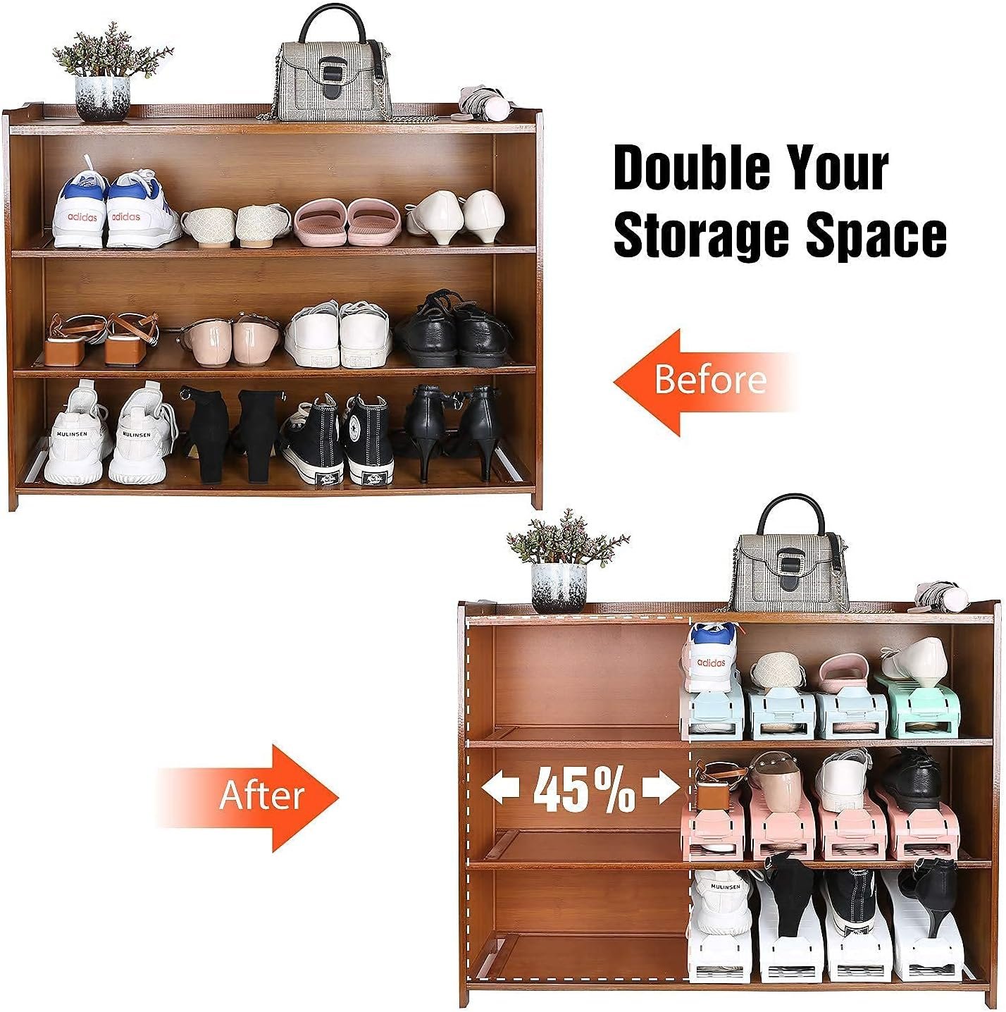 【50% SPACE SAVING】The double deck shoe organizer design help saves 50% of your storage capacity immediately and hlep you find the right shoes quickly, making your shoe closet and garderobe more tidy and orderly.