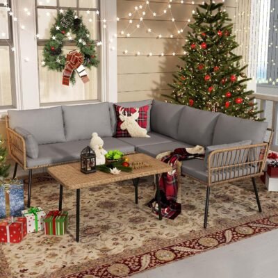 Color Grey Cushion+ Beige Rattan Material PE Rattan+Steel Size of Sofa 74“ L x 28.7“ W x 29.1“ H (L-Shaped) Size of Table 25.4“ L x 20“ W x 18.3“ H Thickness of Cushion 3.15“