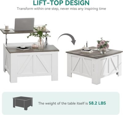【Coffee Table with Lifting Top】The white wooden coffee table experiences smooth and safe lifting with a lifting mechanism featuring gas struts. It can be lifted to a height of 25.2 inches from the ground for convenient office work. The flip design on the other side provides convenient storage and collecting blankets, toys, and other items in the living room.