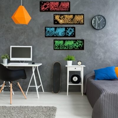 Neon Game Wall Art Set: the package contains 4 pieces of video game decors for boys, which are designed with different sentences and patterns, enough to satisfy your decoration needs for wall at home