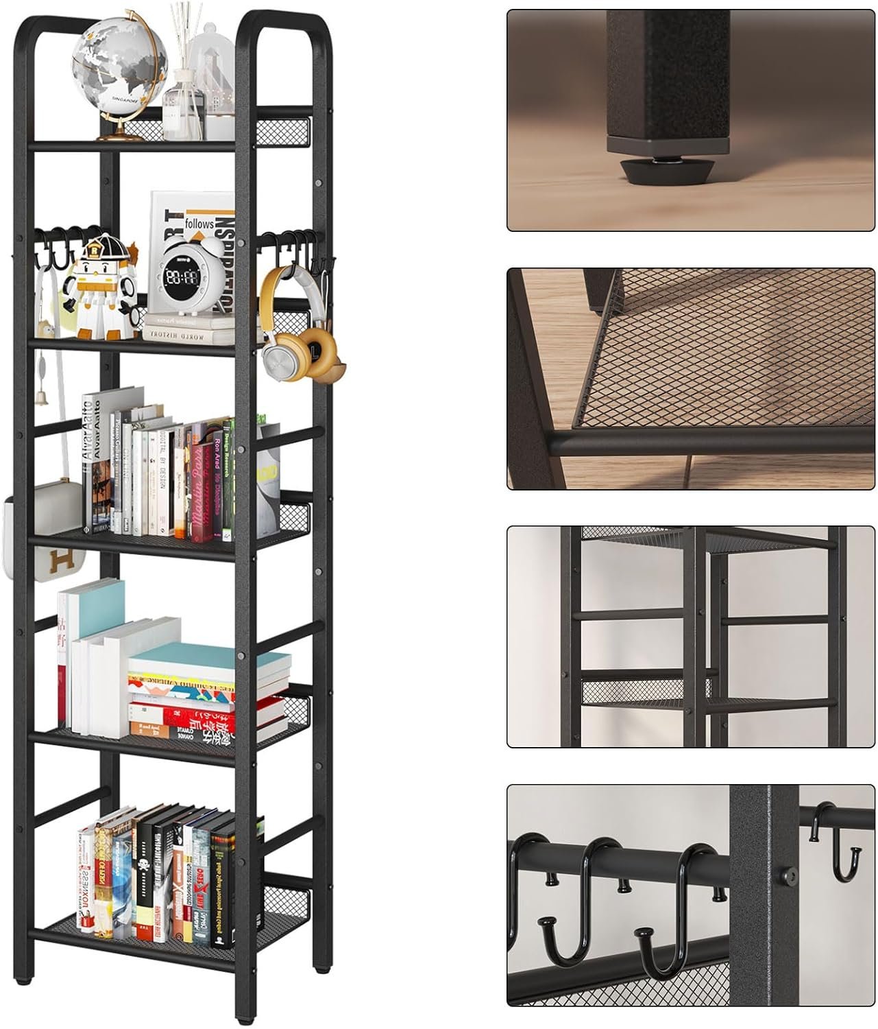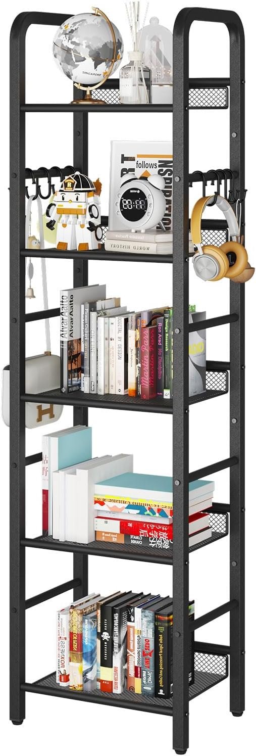 Product Name: YMYNY 5 Tier Bookshelf Product Color: Black Material:Material: High quality metal Product Size: 14.2 x 10.6 x 57.5 inches Product Weight: 9.5 Pounds Package Details: 1 x Assembly Kit, 1 x Instructions, 1 x 5-Tier Bookshelf