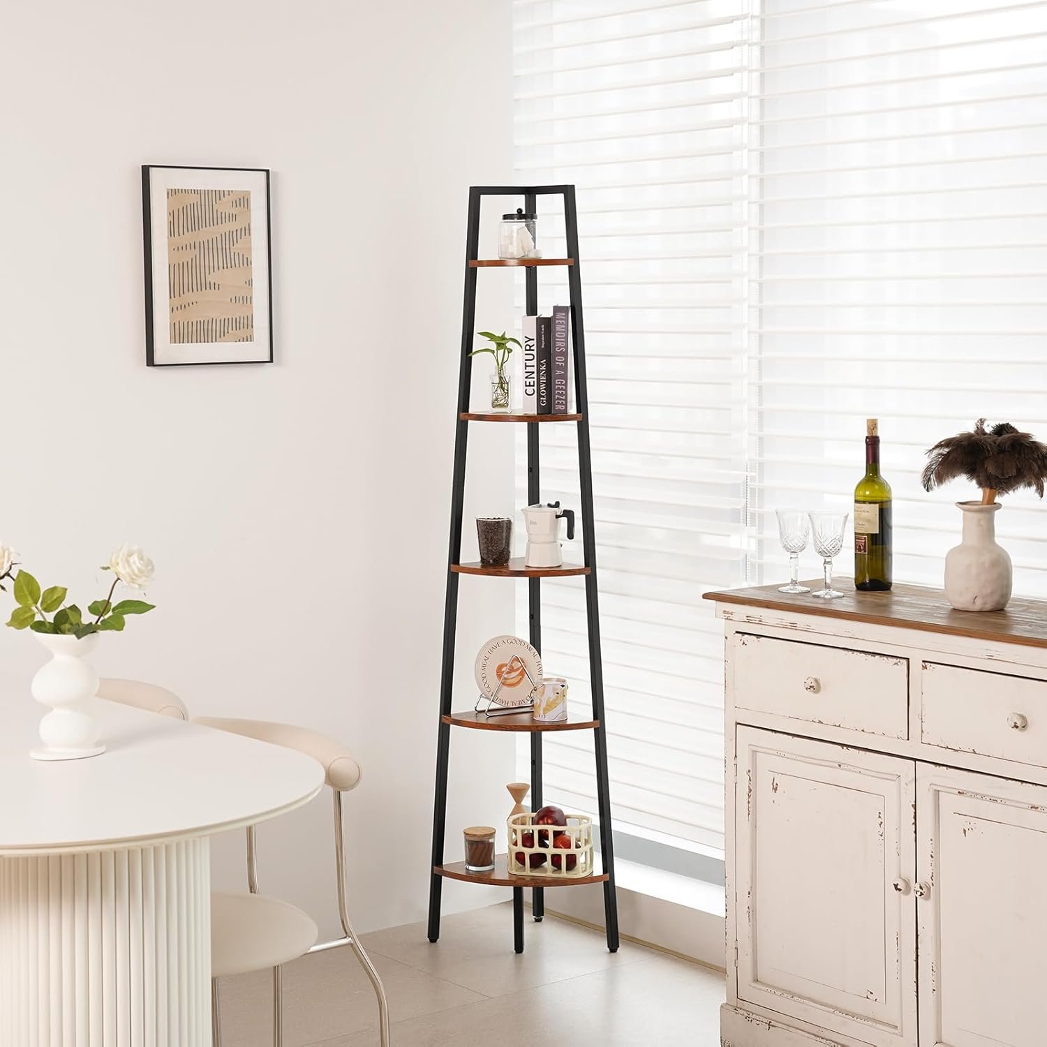 Stylish Space-Saving Shelf: No wall space is wasted with this tall corner shelf! Our ladder corner shelving features a 90° right angle in the rear, fitting snugly against the wall and maximizing limited space. Plus, the round edge design and the combination of elegant wood and black steel tubing give it a chic, vintage look that complements any decor style.