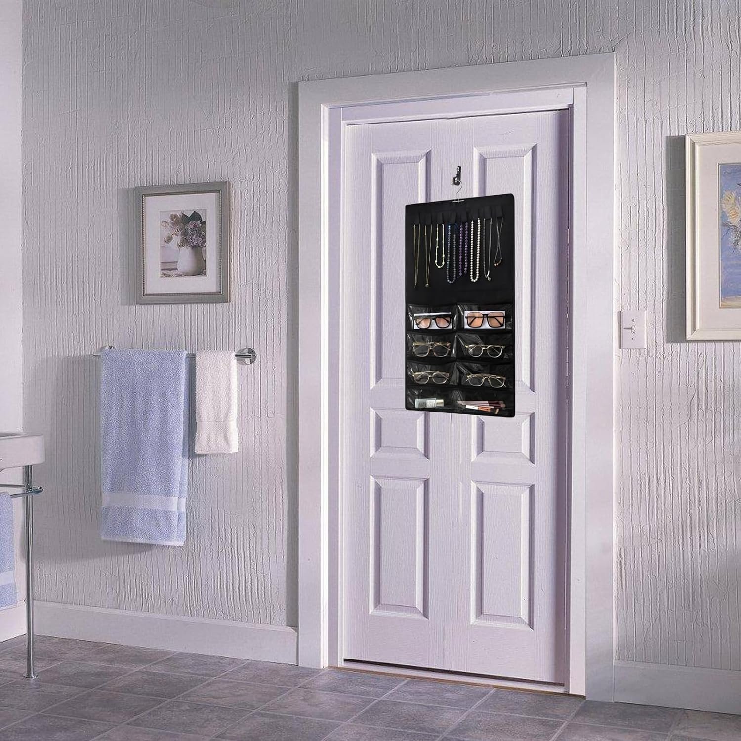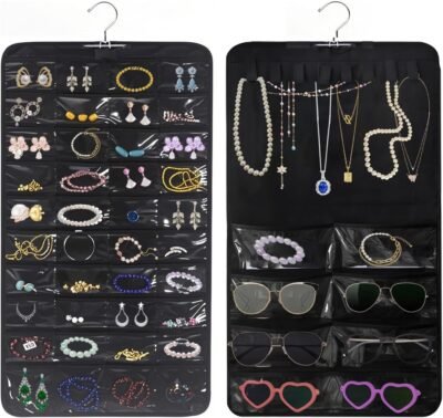 Quality Material: Our double-sided hanging jewelry organizer is made of premium polyester, PVC material and strong metal hooks, which is durable and functional, easily be hung on closet, door and wall